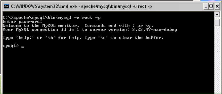 Maka akan muncul sebuah lembar kerja mysql di CMD anda Seperti gambar dibawah ini